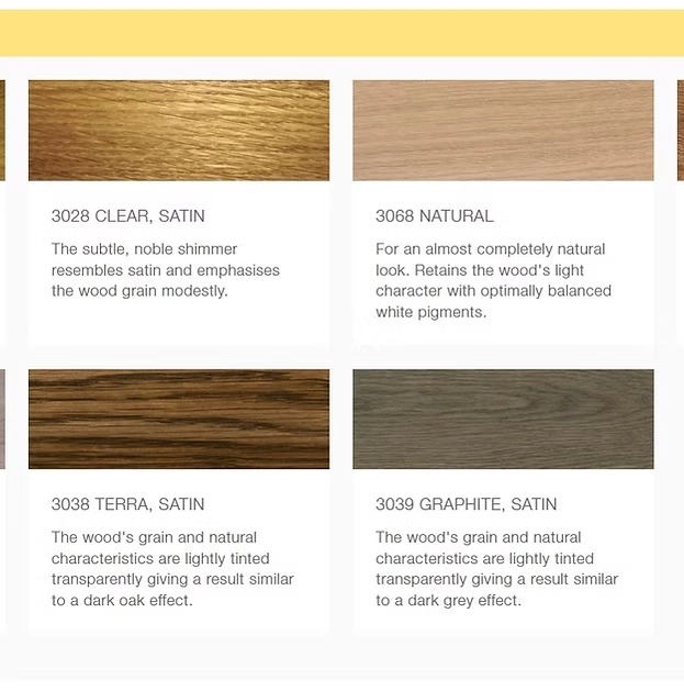 3028 Clear Satin, 3037 White Satin, 3038 Terra Satin, 3039 Graphite Satin, 3058 Clear Matt, 3061 Acacia Matt, 3068 Natural